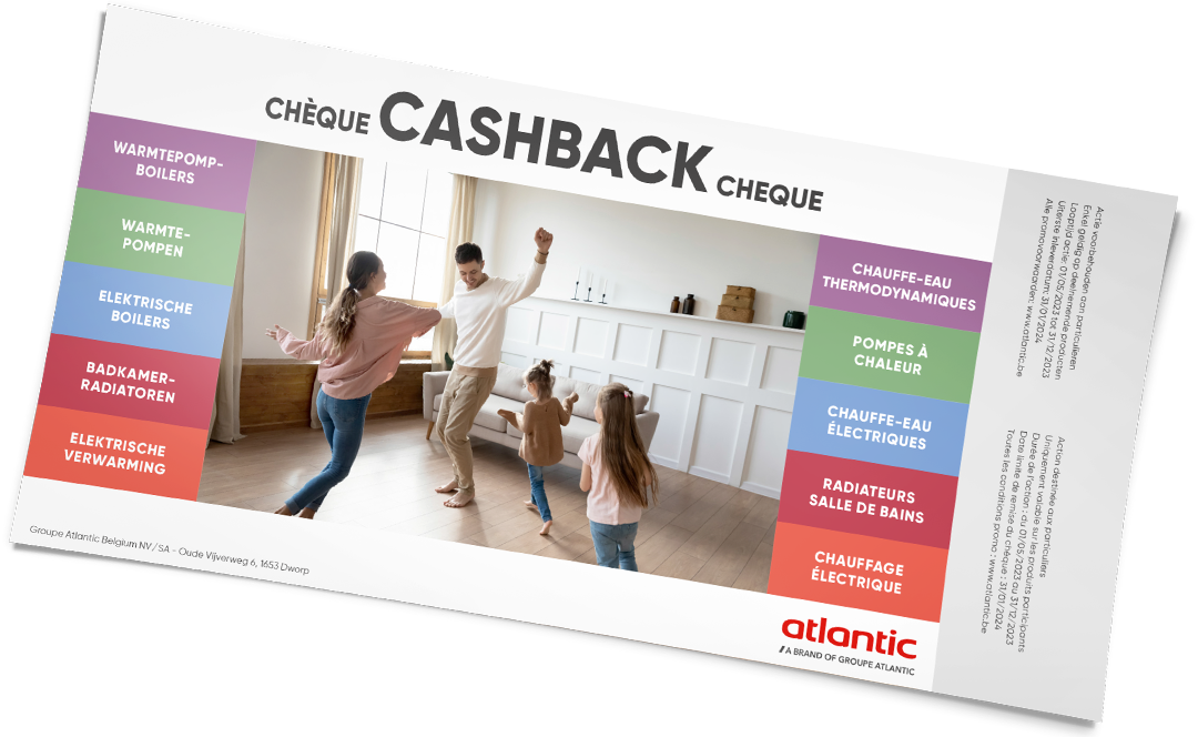 Geniet nu van € 100 korting op alle Atlantic-warmtepompboilers. Vraag je CASHBACK-CHEQUE aan via je Atlantic-installateur, via www.atlantic.be of via ons contactformulier.